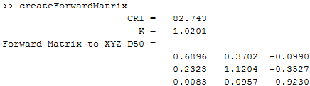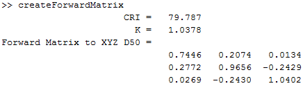 I effectively followed that last procedure but using Matlab/Octave instead of Excel, if you would like to follow along you can download the routine I used from the relative note at the bottom of the article. Excellent toolkit OptProp and its built-in ColorChecker reference data lent a helping hand[4]. This is the Forward Matrix
