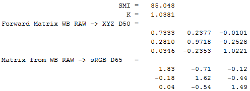 The product of this and the forward matrices calculated earlier produces the following combined white balanced raw