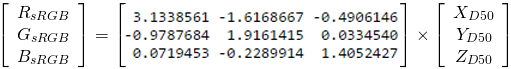 (1) ![Rendered by QuickLaTeX.com \begin{equation*} \left[ \begin{array}{c} X_{D50} \\ Y_{D50} \\ Z_{D50} \end{array} \right] = \begin{bmatrix} a_{11} & a_{12} & a_{13} \\ a_{21} & a_{22} & a_{23} \\ a_{31} & a_{32} & a_{33} \end{bmatrix} \left[ \begin{array}{c} r \\ g \\ b \end{array} \right] \end{equation*}](https://i0.wp.com/www.strollswithmydog.com/wordpress/wp-content/ql-cache/quicklatex.com-b9f4277814179e1fbcf64e1a69a53818_l3.png?resize=273%2C64&ssl=1)